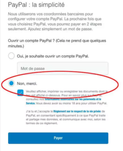 En bas de ce formulaire, dans la rubrique « Ouvrir un compte Paypal », cliquez sur « Non, merci » (entouré en rouge sur l’illustration ci-dessous) et ensuite sur la case pour accepter le « Règlement sur la vie privée » que vous pouvez consulter auparavant en cliquant sur la phrase en bleu. Pour terminer, validez votre paiement en cliquant sur le bouton « Payer ». C’est terminé !